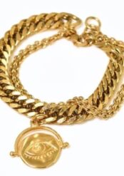 Βραχιόλι με διπλή αλυσίδα από ανοξείδωτο ατσάλι με επιχρύσωση 18Κ και κρεμαστό στοιχείο – Μάτι από ζάμακ με επιχρύσωση 24Κ