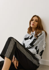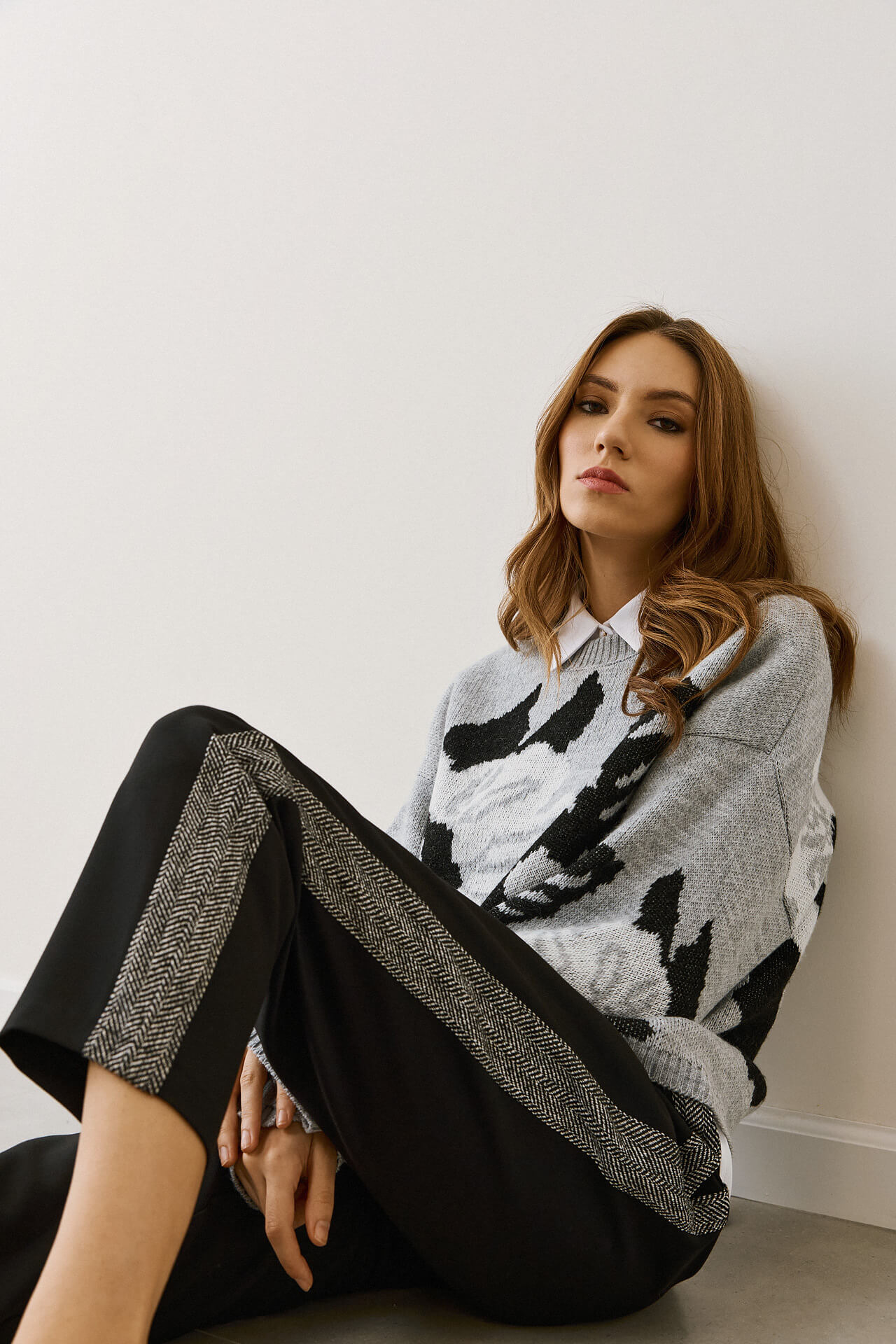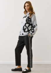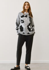 Ανανεώστε το στυλ σας με αυτό το γκρι πουλόβερ με φλοράλ μοτίβο, που συνδυάζει θηλυκότητα και cozy κομψότητα. Το μαλακό πλεκτό ύφασμα αγκαλιάζει το σώμα με άνεση, ενώ το εντυπωσιακό φλοράλ σχέδιο σε μαύρες και λευκές αποχρώσεις χαρίζει μοντέρνα, καλλιτεχνική αισθητική.