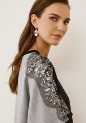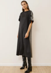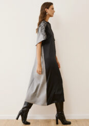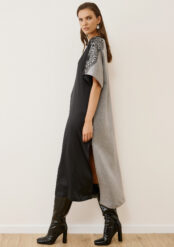 Το δίχρωμο φόρεμα με κέντημα στους ώμους είναι ένα statement κομμάτι που συνδυάζει την άνεση με την υψηλή αισθητική. Το εμπρός μέρος σε μαύρη σατινέ υφή και η πίσω πλευρά σε γκρι βαμβακερό ύφασμα δημιουργούν μια αρμονική αντίθεση, ενώ τα χειροποίητα κεντήματα με πούλιες και πέτρες στους ώμους προσθέτουν πολυτέλεια και λάμψη.