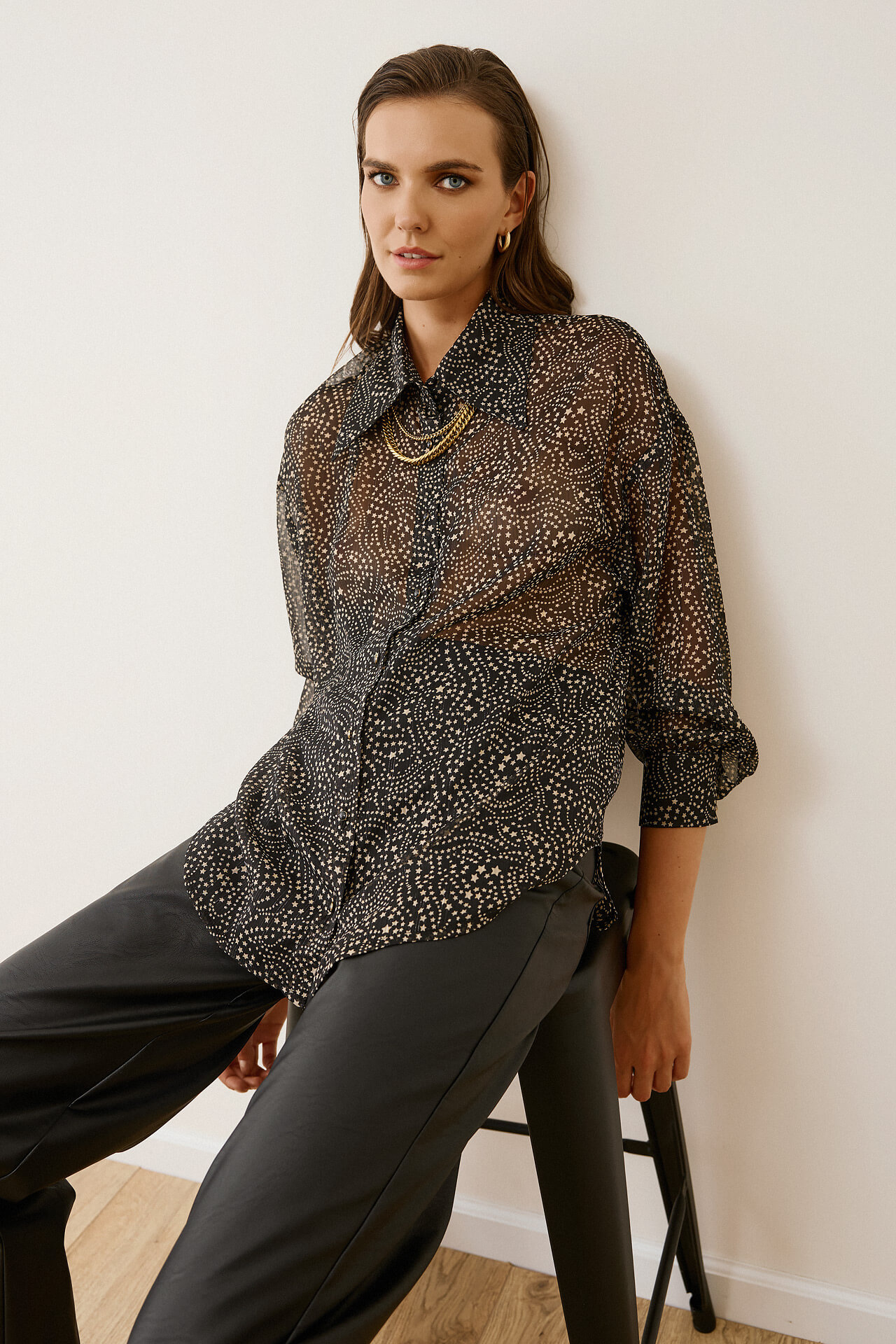 Ημιδιάφανο μαύρο πουκάμισο με εκρού αστεράκια, ελληνικής κατασκευής με διακριτικό μοτίβο. Κομψό, ανάλαφρο και θηλυκό