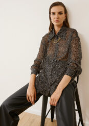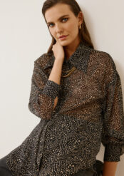 Ανακάλυψε το ημιδιάφανο μαύρο πουκάμισο με εκρού αστεράκια, σχεδιασμένο και ραμμένο στην Ελλάδα. Ένα κομψό, αέρινο κομμάτι που αποπνέει θηλυκότητα και δυναμισμό. Η διακριτική διαφάνεια του υφάσματος αγκαλιάζει το σώμα, ενώ το minimal μοτίβο του προσθέτει λάμψη και στυλ χωρίς υπερβολές.