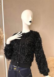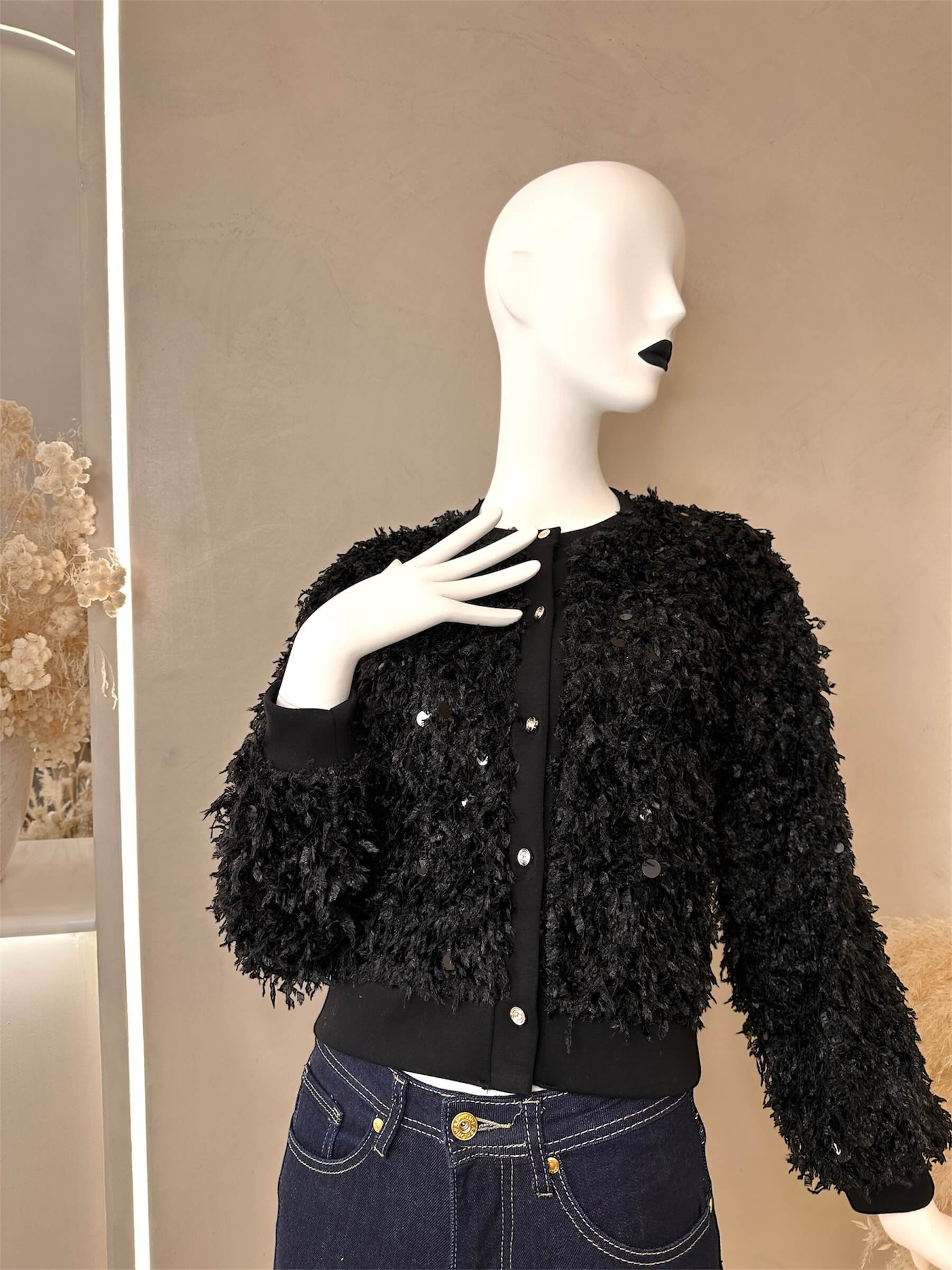 Εντυπωσιακή μαύρη ζακέτα με fluffy υφή, λαμπερές παγιέτες και κομψό κούμπωμα. Ζεστή, απαλή και ιδανική για glamorous εμφανίσεις.