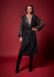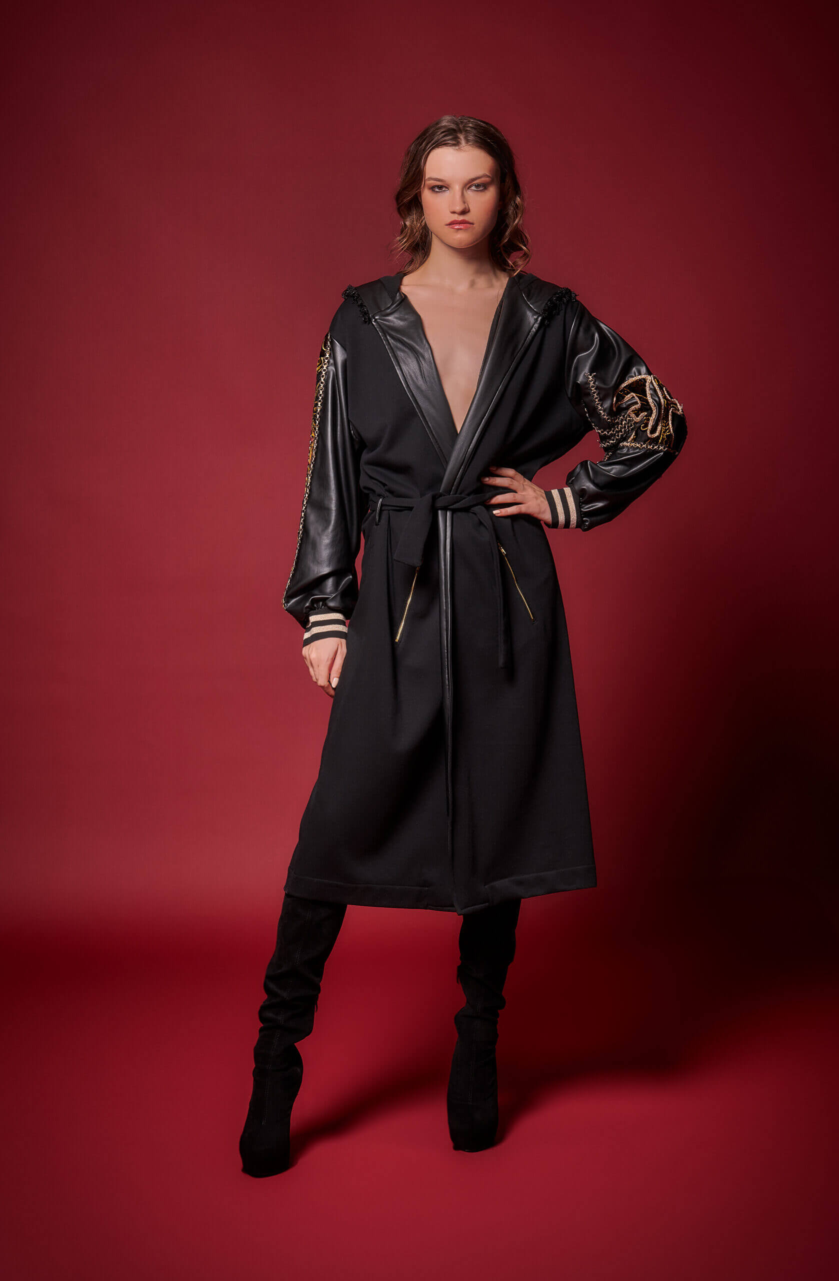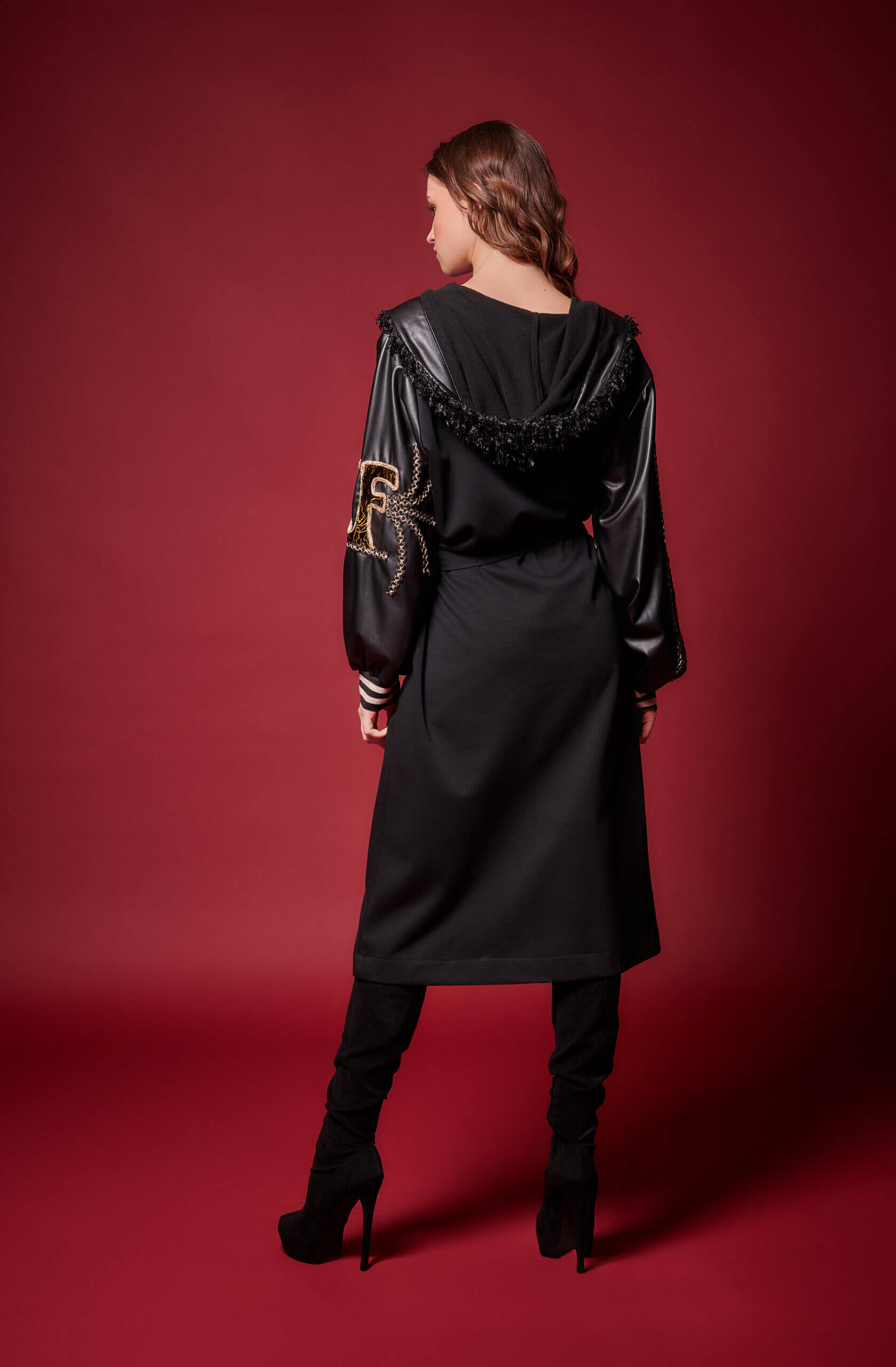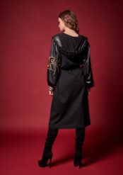 Μαύρη μακριά ζακέτα με κουκούλα, δερματίνη και κεντημένες λεπτομέρειες.