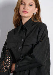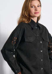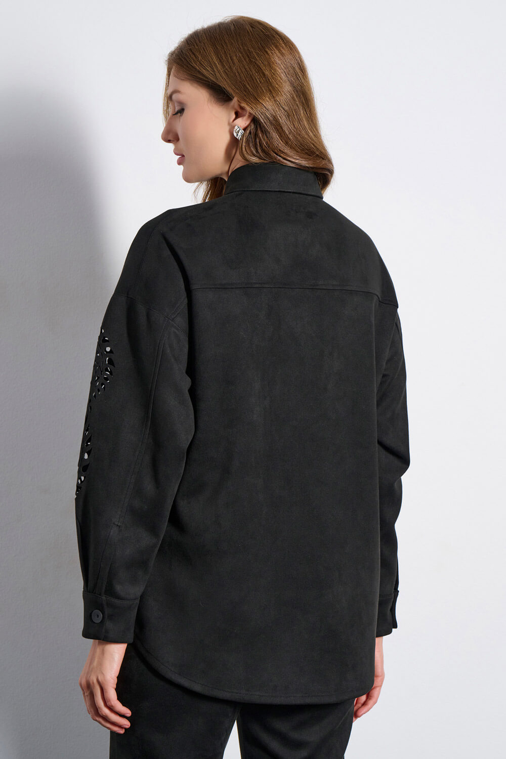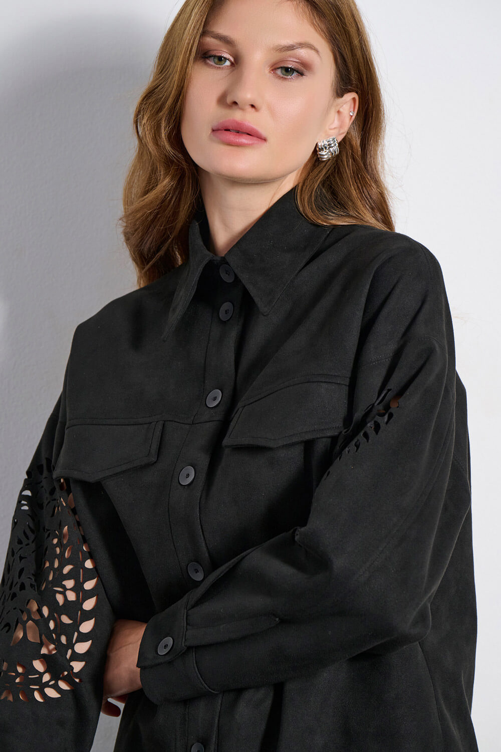 Κομψό σουέτ πουκάμισο με εντυπωσιακό laser cut σχέδιο στα μανίκια, σε oversized γραμμή για απόλυτη άνεση και στυλ.