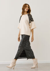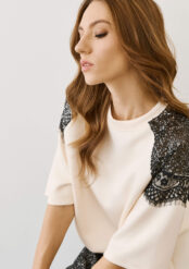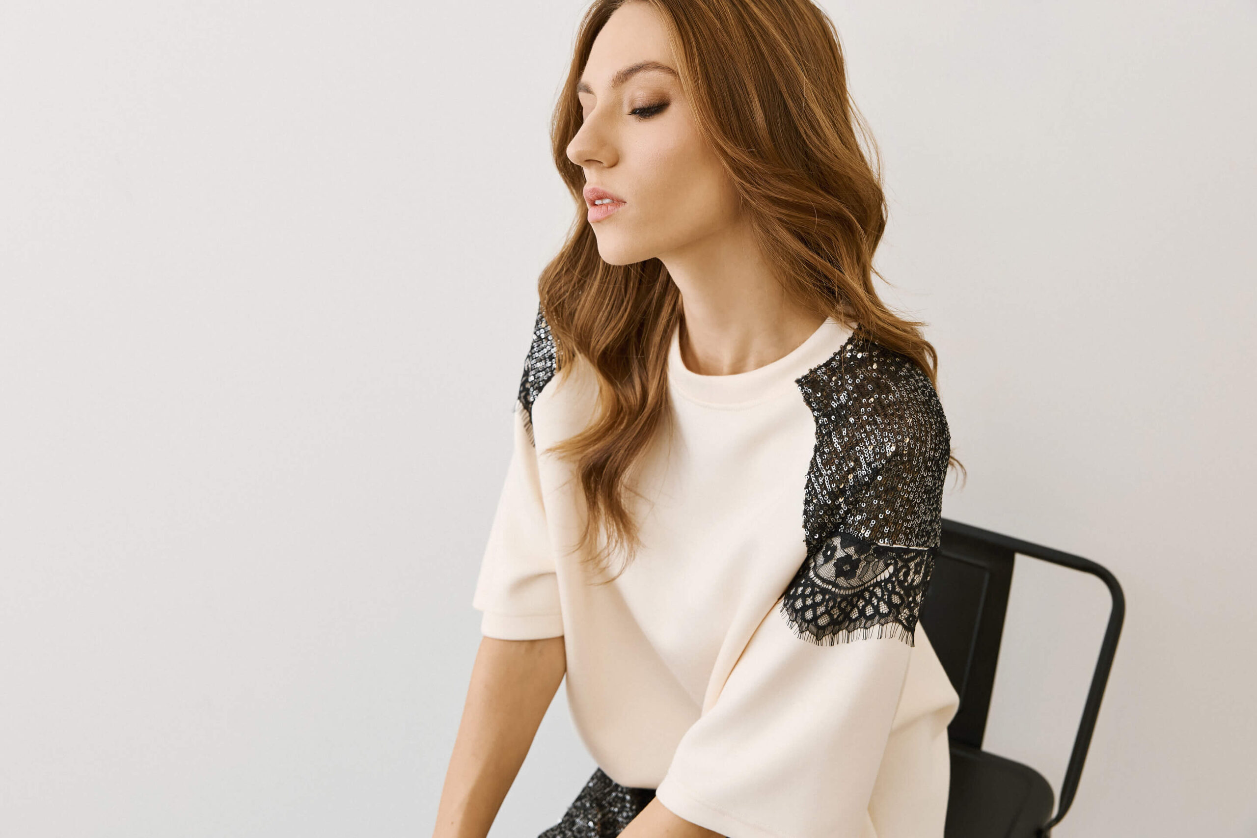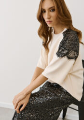 Εκρού μπλούζα με κοντό μανίκι. Διαθέτει μαύρη δαντέλα και παγιέτα στους ώμους ως διακοσμητικά στοιχεία. Έχει άνετη γραμμή και μπορεί να φορεθεί είτε με casual ντύσιμο είτε με πιο επίσημο.