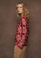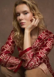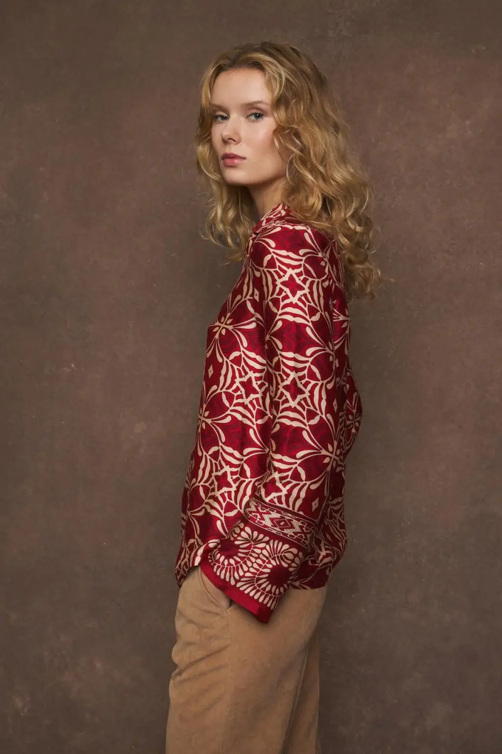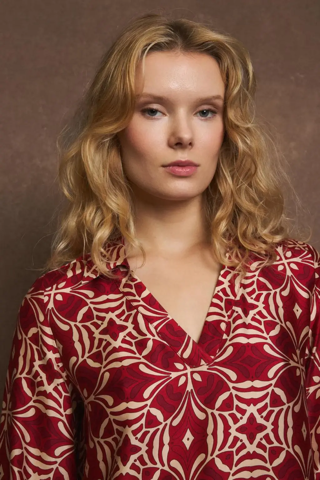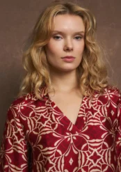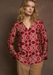 Η μπλούζα είναι μακρυμάνικη και έχει έναν κομψό, χαλαρό σχεδιασμό με V-ντεκολτέ. Το ύφασμά της έχει σατέν υφή και κυριαρχεί το έντονο μπορντό-κόκκινο χρώμα με συμμετρικά γεωμετρικά και λουλουδένια μοτίβα σε μπεζ/χρυσό. Στα μανίκια υπάρχει διαφοροποίηση στο σχέδιο, με περισσότερο διακοσμητικά μοτίβα στο τελείωμα, κάτι που δίνει μια έμφαση στις λεπτομέρειες.
