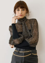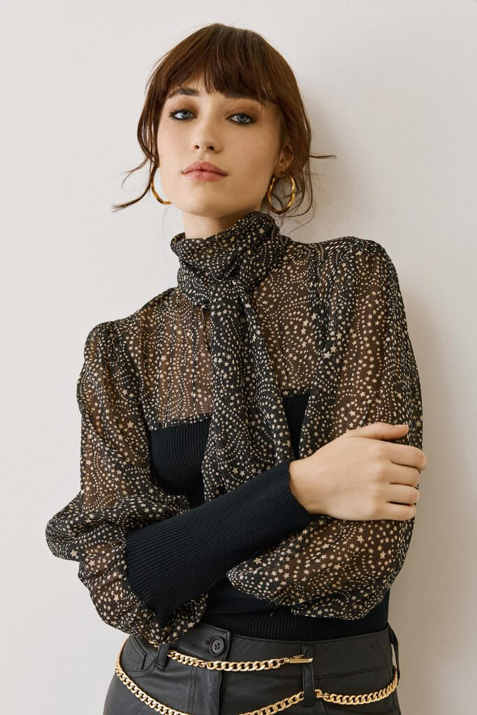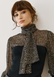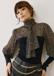 Η διαφανής μπλούζα με πουά και φιόγκο είναι το απόλυτο fashion statement της σεζόν. Με αέρινο ύφασμα, ψηλό λαιμό και balloon μανίκια με φαρδιές ριμπ μανσέτες, προσφέρει έναν τέλειο συνδυασμό κομψότητας και θηλυκότητας.