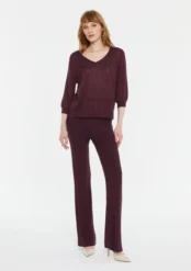 Κομψή μπλούζα με λάμψη σε μπορντό απόχρωση, με V λαιμόκοψη και 3/4 μανίκια. Ιδανική για εντυπωσιακές, αλλά άνετες εμφανίσεις.