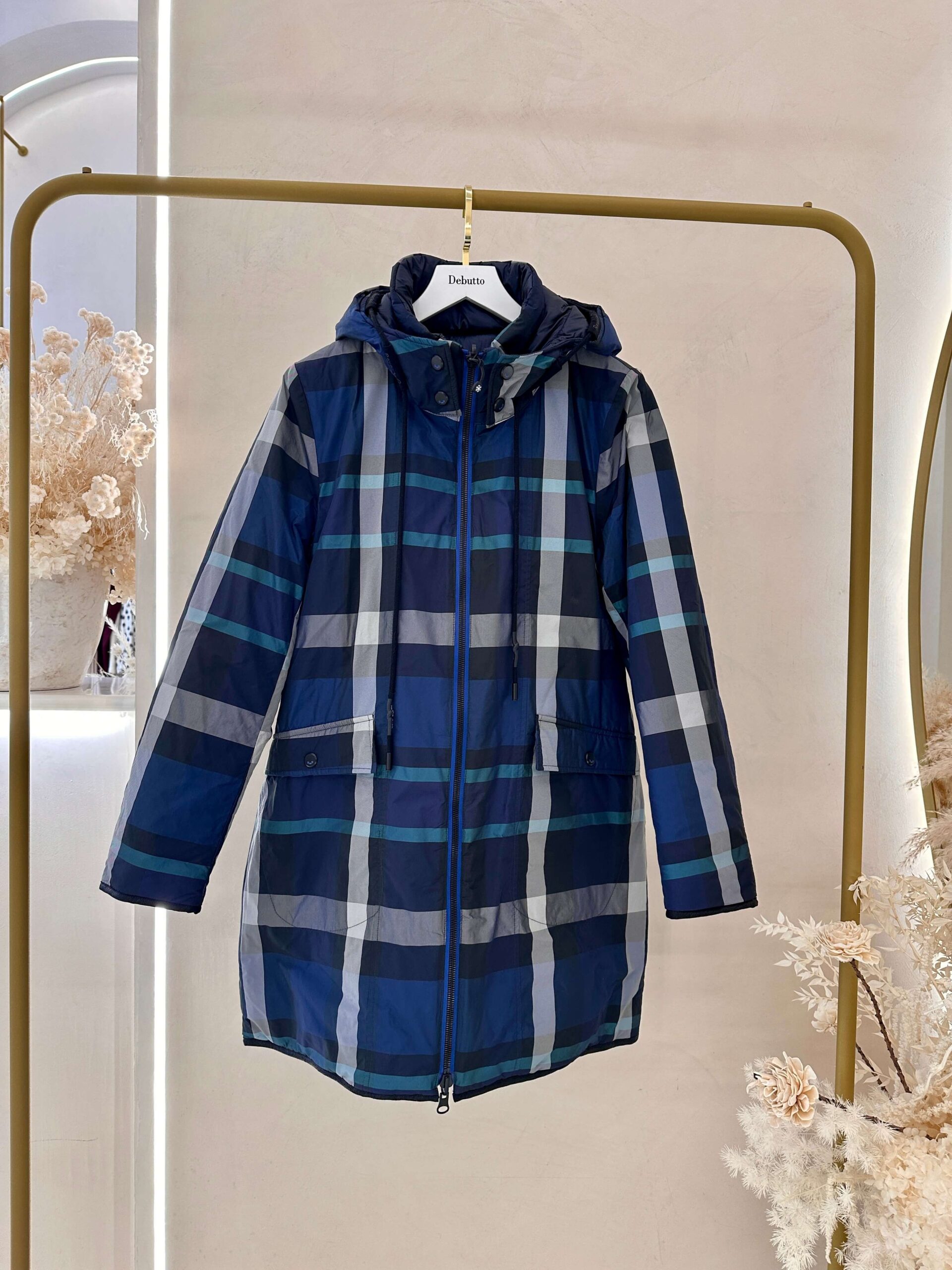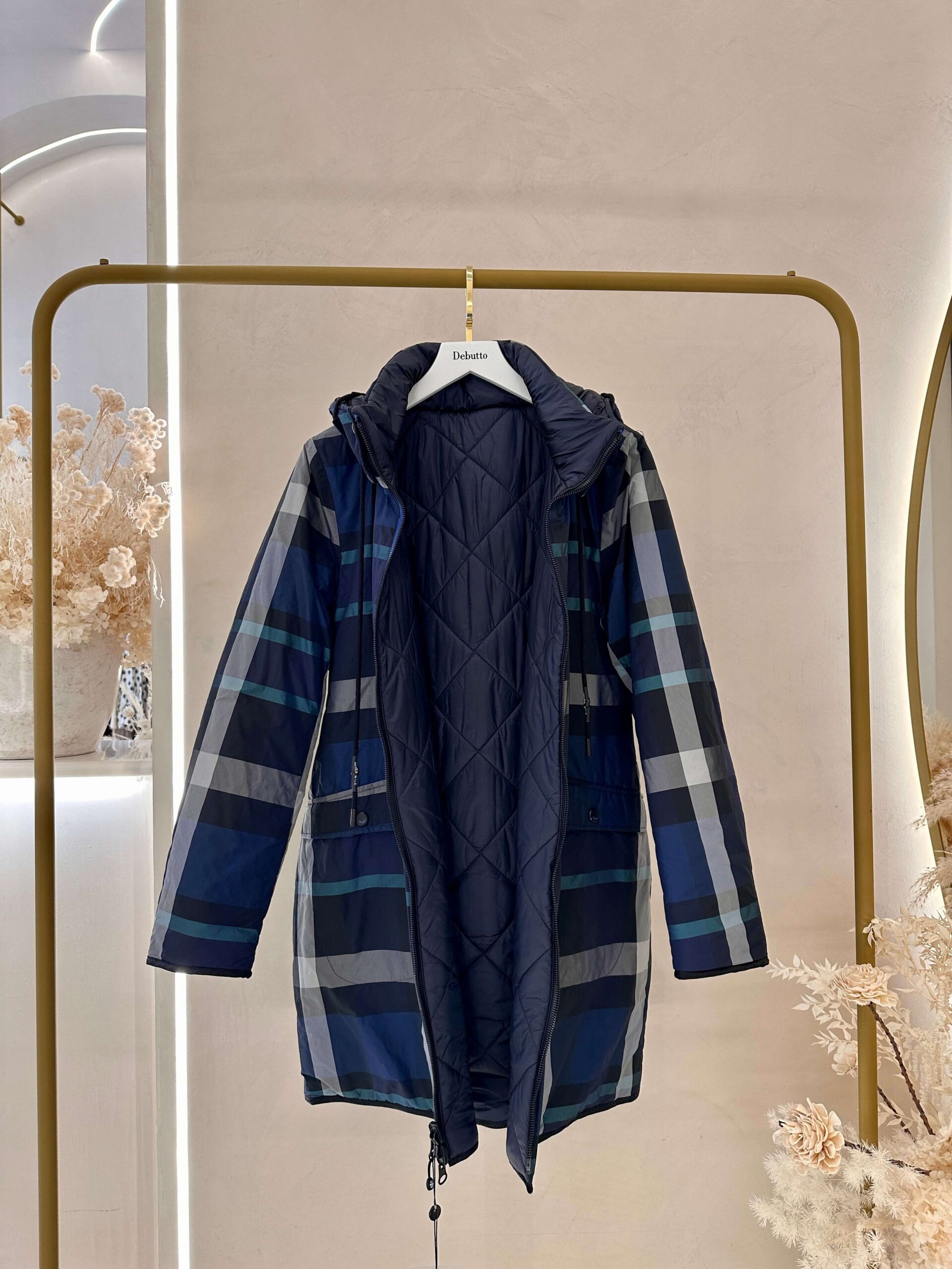 Γυναικείο μπουφάν διπλής όψης μπλε καρό με κουκούλα, πρακτικές τσέπες και καπιτονέ υφή.