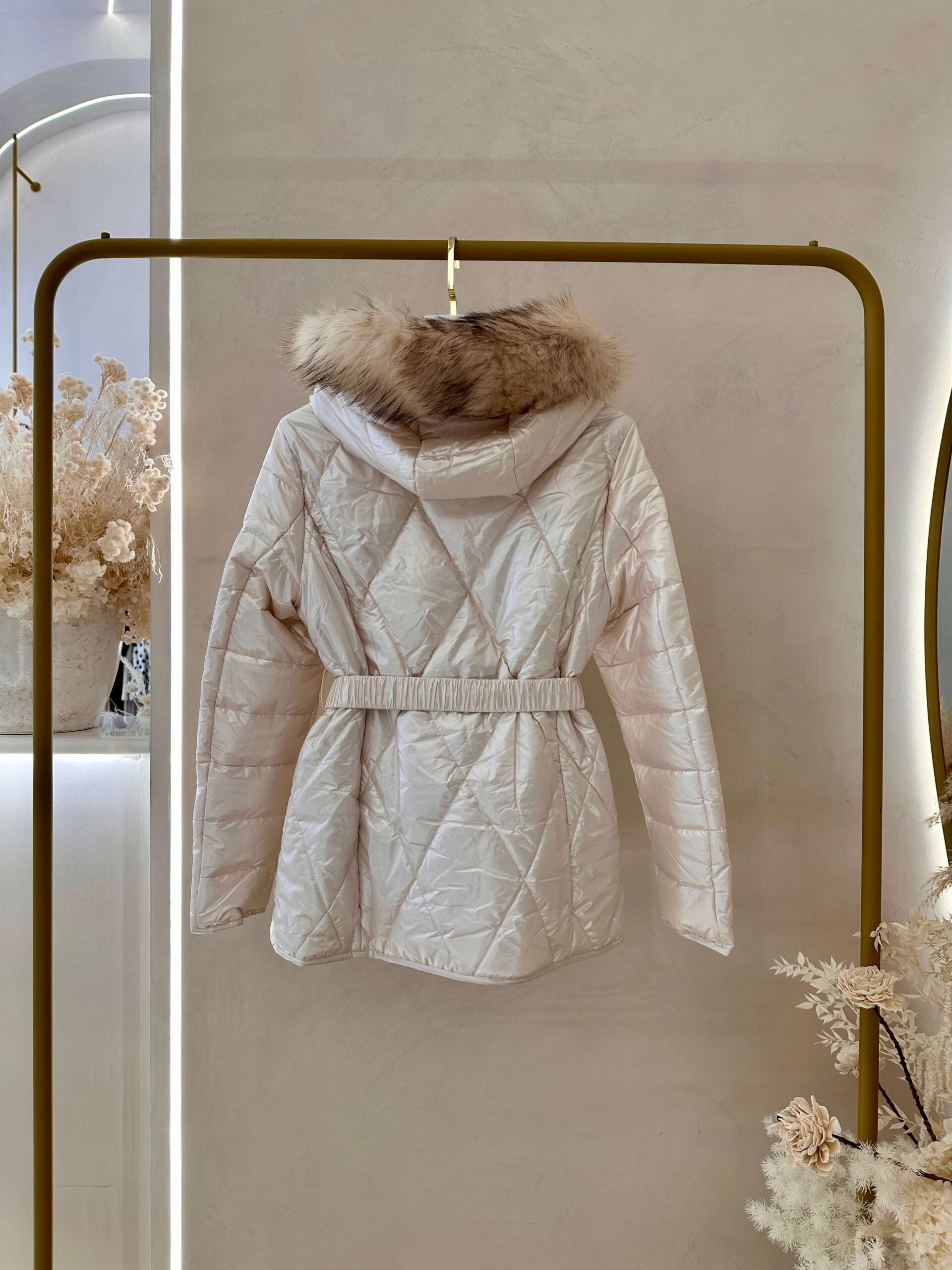 Γυναικείο μπουφάν εκρού με γούνα στην κουκούλα, ζώνη στη μέση και πρακτικές τσέπες.
