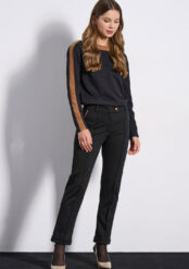 Μαύρο παντελόνι με λεπτομέρειες σουέτ και ρεβέρ στο τελείωμα. Κομψό, άνετο και ιδανικό για καθημερινό ή office look.