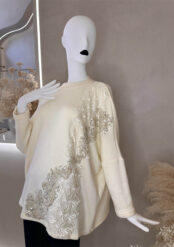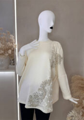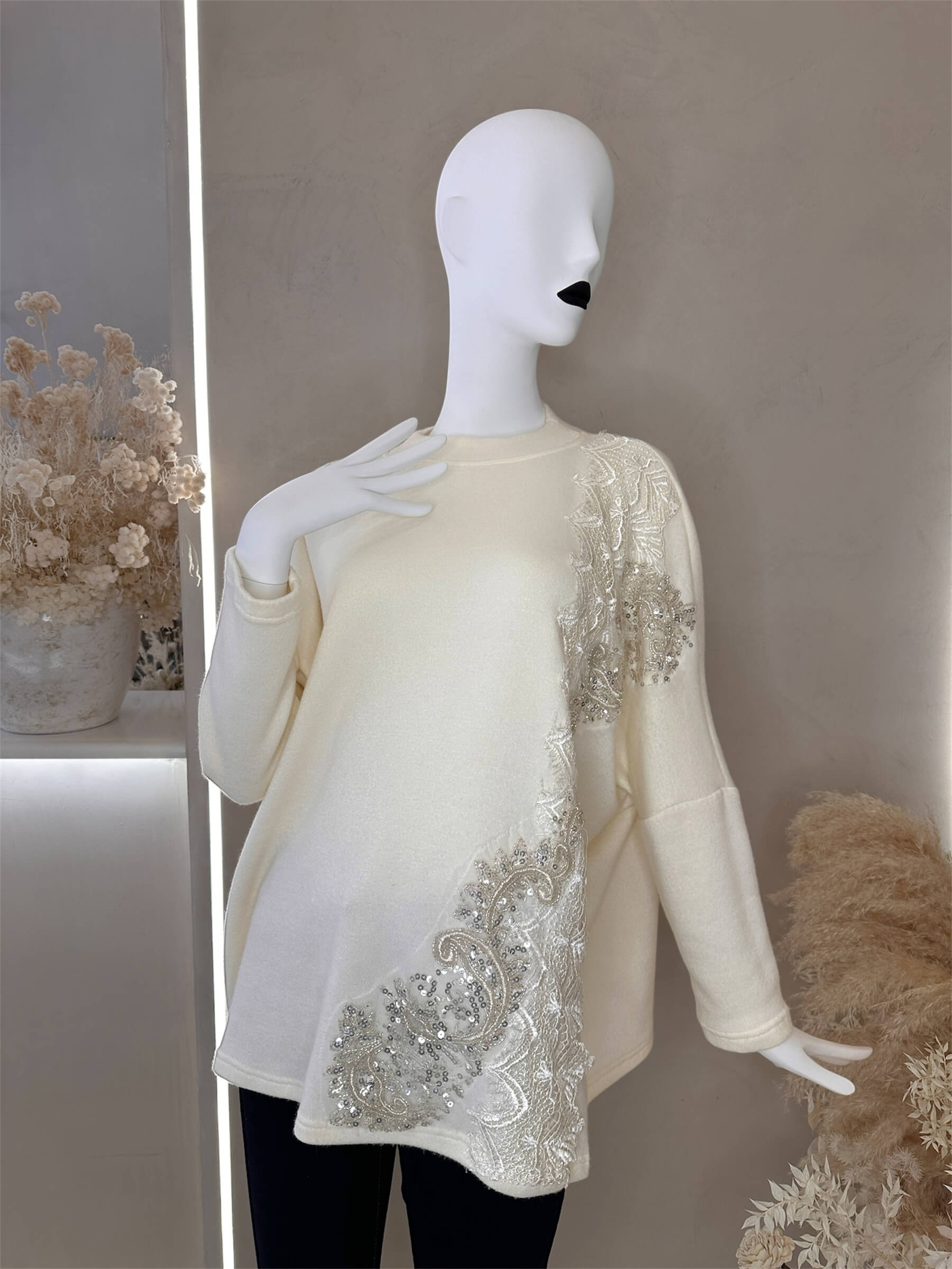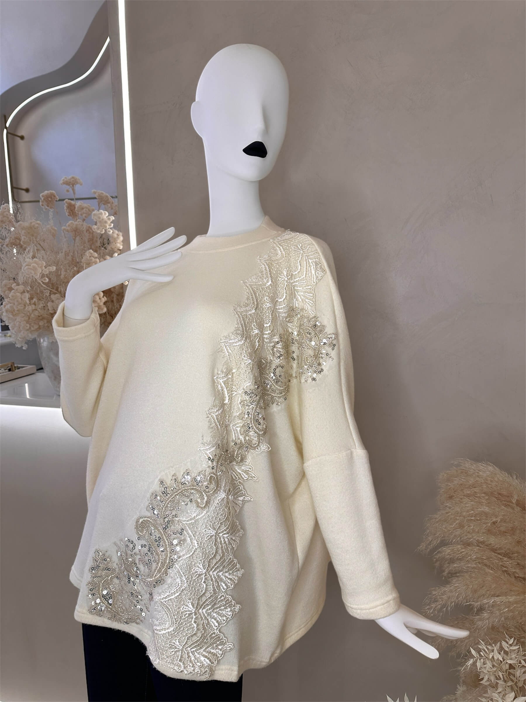 Elegant πλεκτή μπλούζα με δαντέλα και παγιέτες σε κρεμ χρώμα. Ασύμμετρη διακόσμηση, απαλή πλέξη και oversized εφαρμογή για εντυπωσιακές καθημερινές εμφανίσεις.