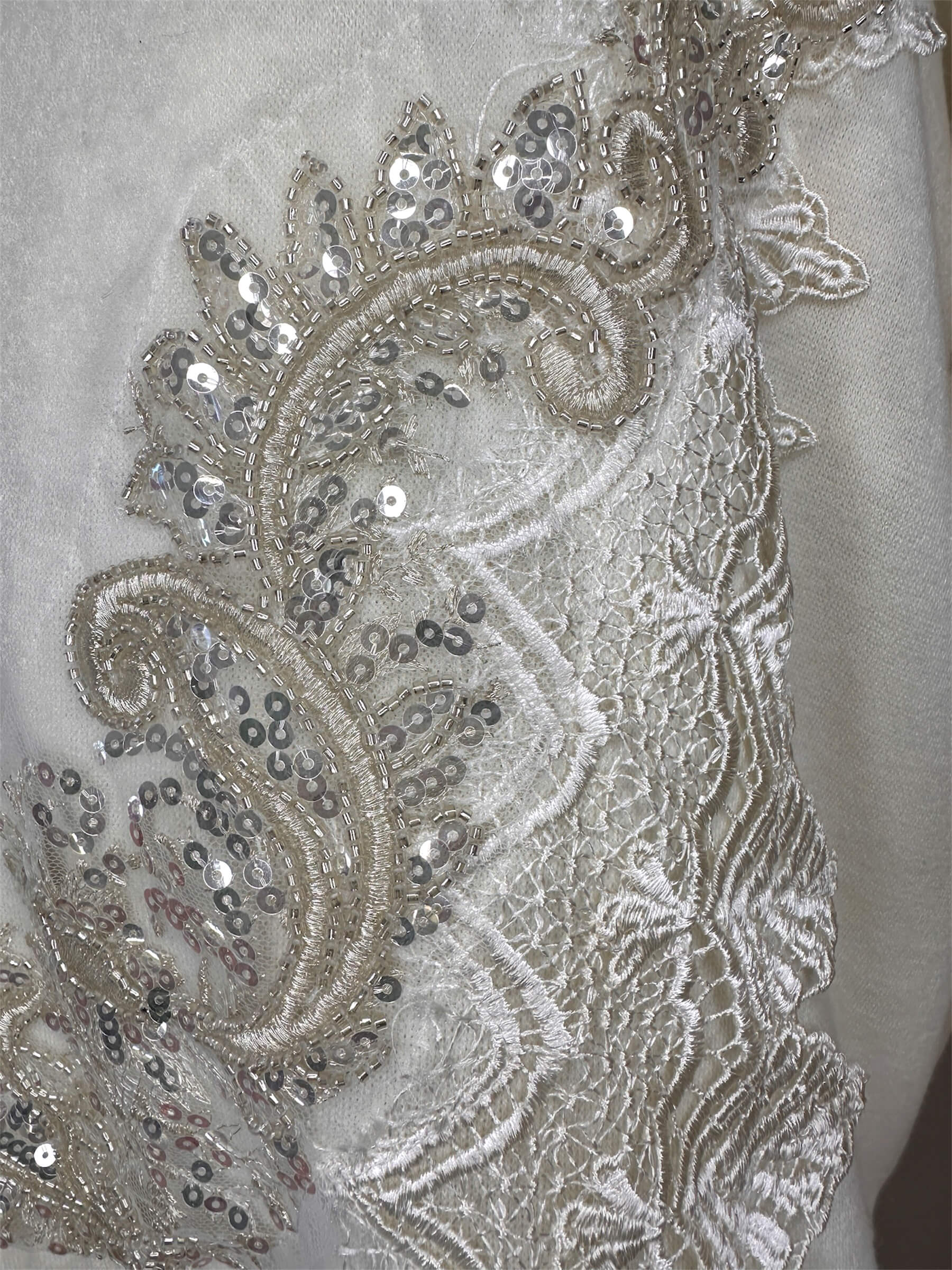 Η πλεκτή μπλούζα με δαντέλα και παγιέτες είναι ένα statement κομμάτι που συνδυάζει άνεση και πολυτέλεια σε απόλυτη ισορροπία. Η απαλή κρεμ βάση προσφέρει ζεστασιά και φινέτσα, ενώ η εξαιρετική δαντέλα με κεντητές παγιέτες και χάντρες δημιουργεί ένα εντυπωσιακό, ασύμμετρο σχέδιο που τραβά όλα τα βλέμματα.