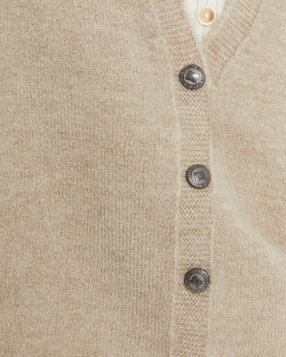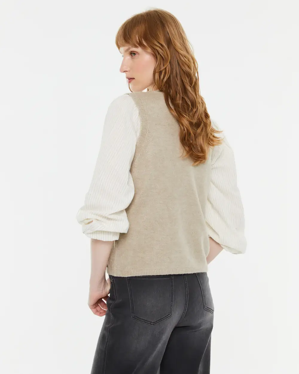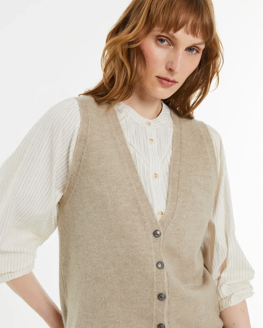 Κομψό και μαλακό πλεκτό γιλέκο. Διαθέτει V λαιμόκοψη, κουμπιά μπροστά και κανονική εφαρμογή. Ιδανικό για layering πάνω από πουκάμισα ή φορέματα, προσφέροντας άνεση και στυλ για όλες τις ώρες.