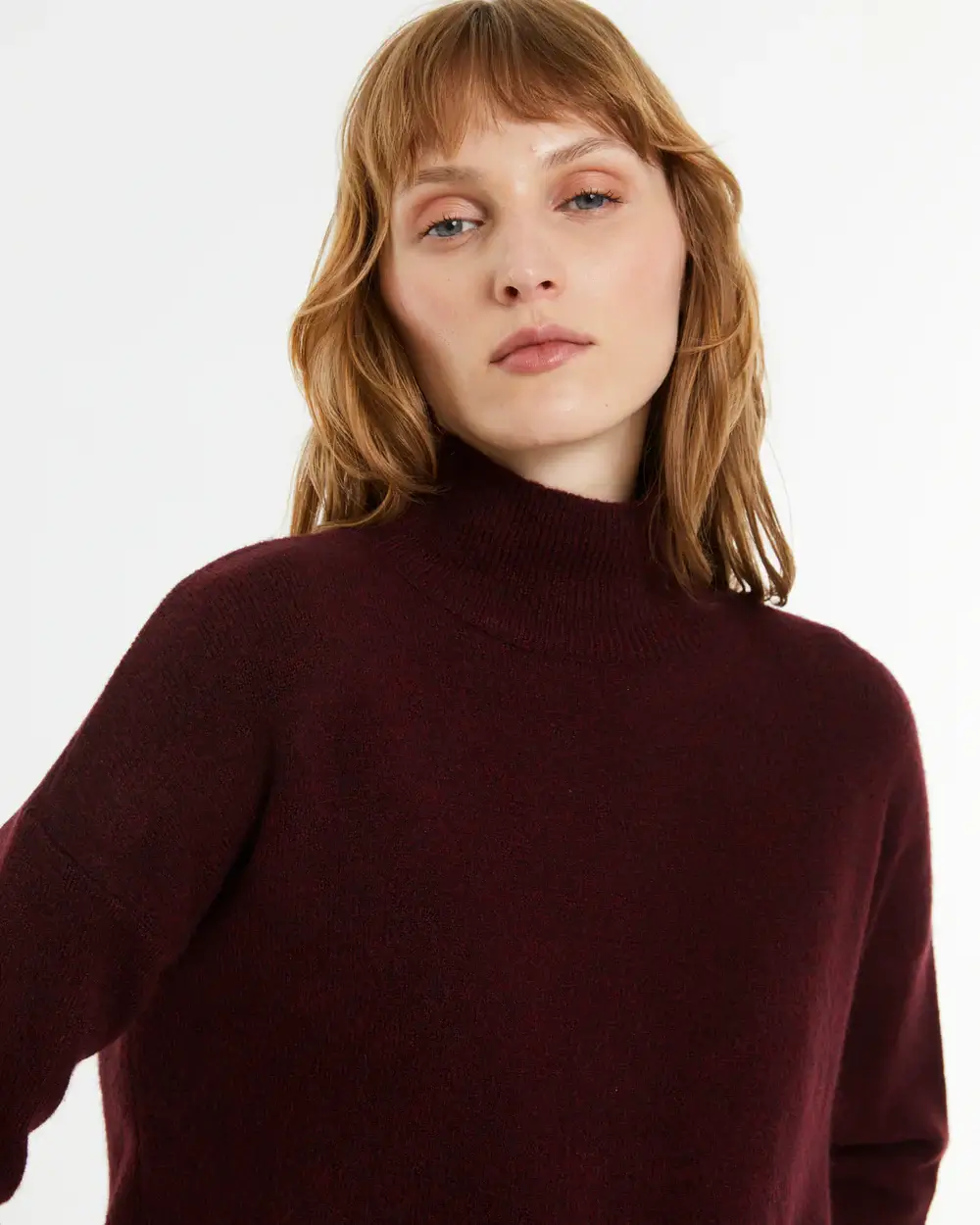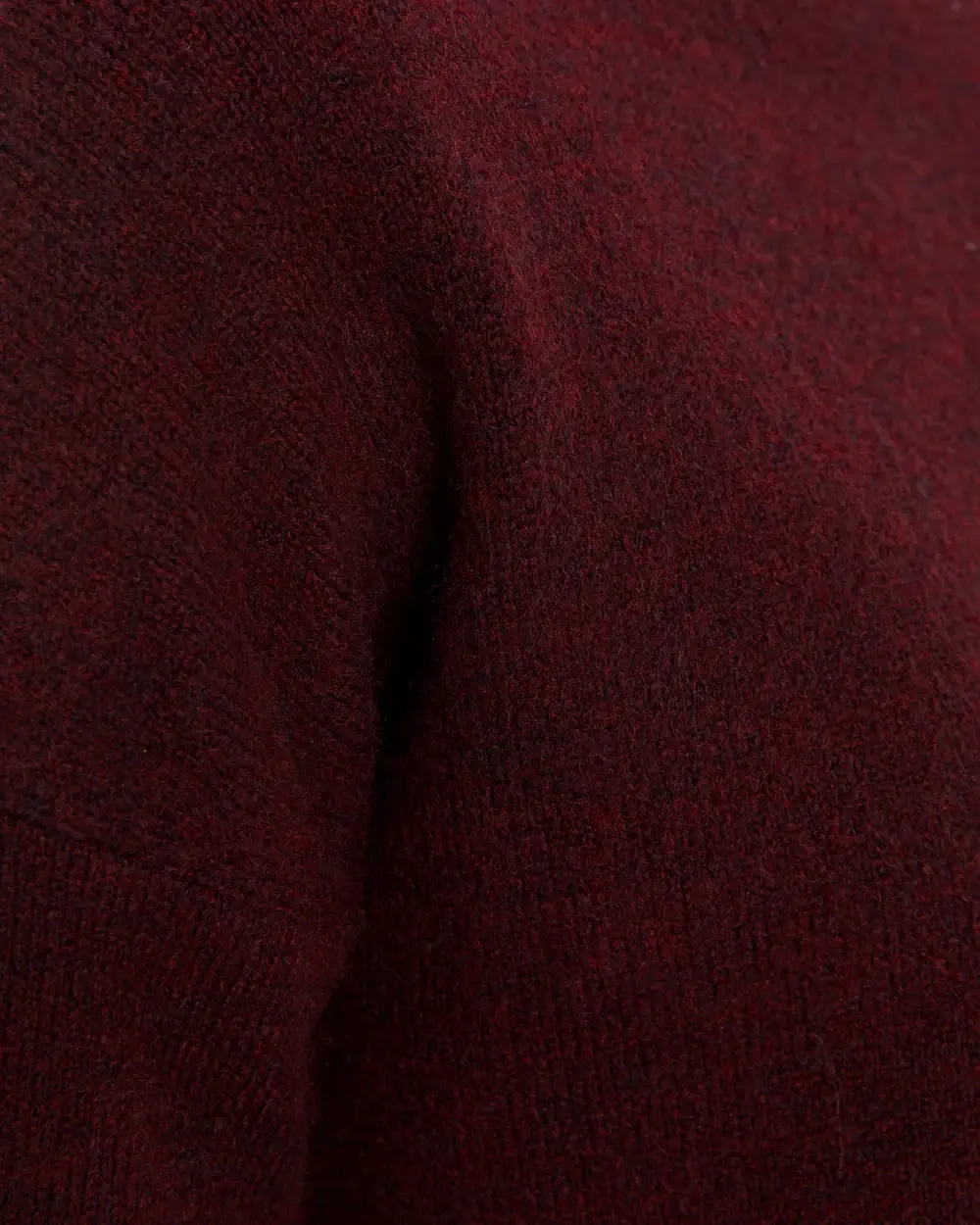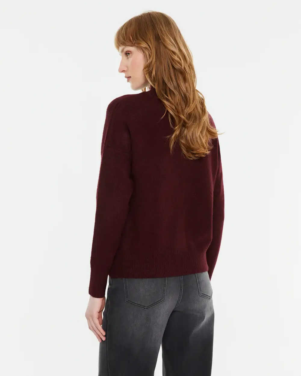 Το ζιβάγκο τελείωμα προστατεύει τον λαιμό και προσθέτει minimal κομψότητα, καθιστώντας το ιδανικό τόσο για casual όσο και για πιο προσεγμένα looks. Επιπλέον, η βαθιά μπορντό απόχρωση χαρίζει ένταση και φινέτσα, συνδυαζόμενη εύκολα με τζιν, υφασμάτινα παντελόνια ή φούστες.
