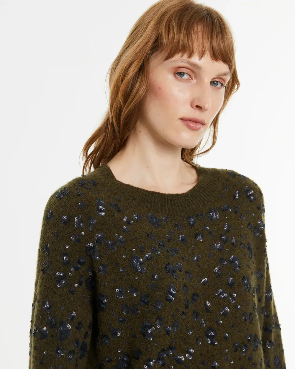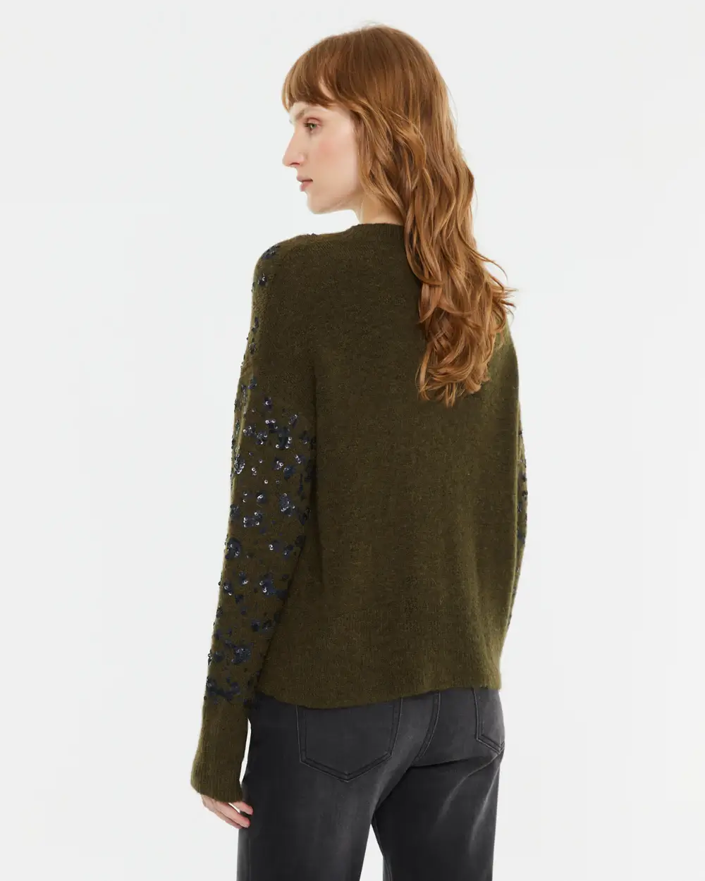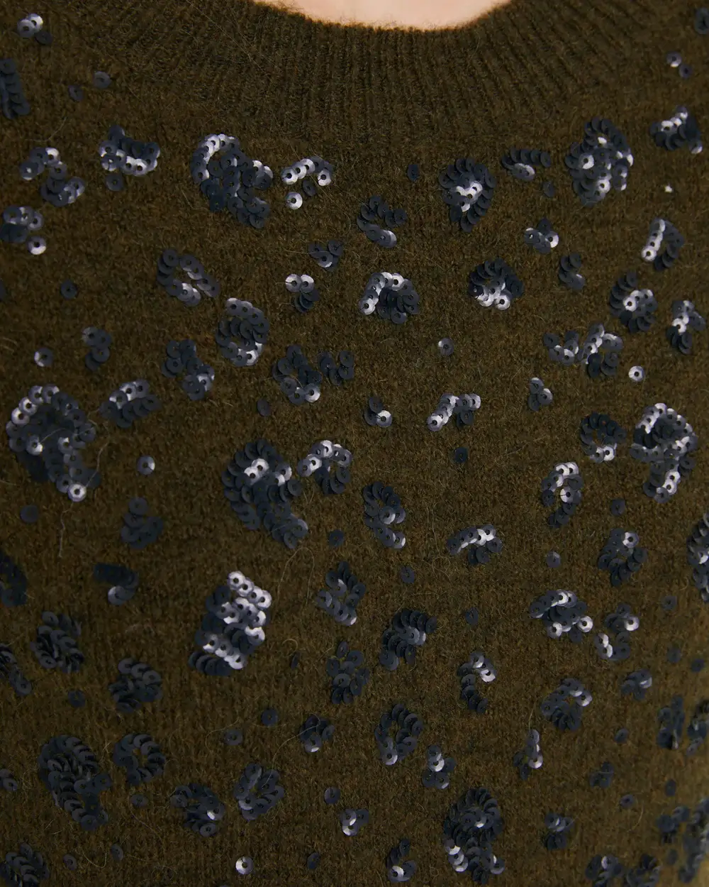 Οι μικρές, διακριτικές παγιέτες είναι ενσωματωμένες αρμονικά στο ύφασμα, χαρίζοντας μια elegant λάμψη χωρίς υπερβολές. Παράλληλα, η χακί απόχρωση προσθέτει φυσικότητα και διαχρονικό χαρακτήρα, καθιστώντας το πουλόβερ εύκολο στους συνδυασμούς.