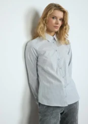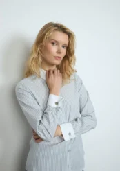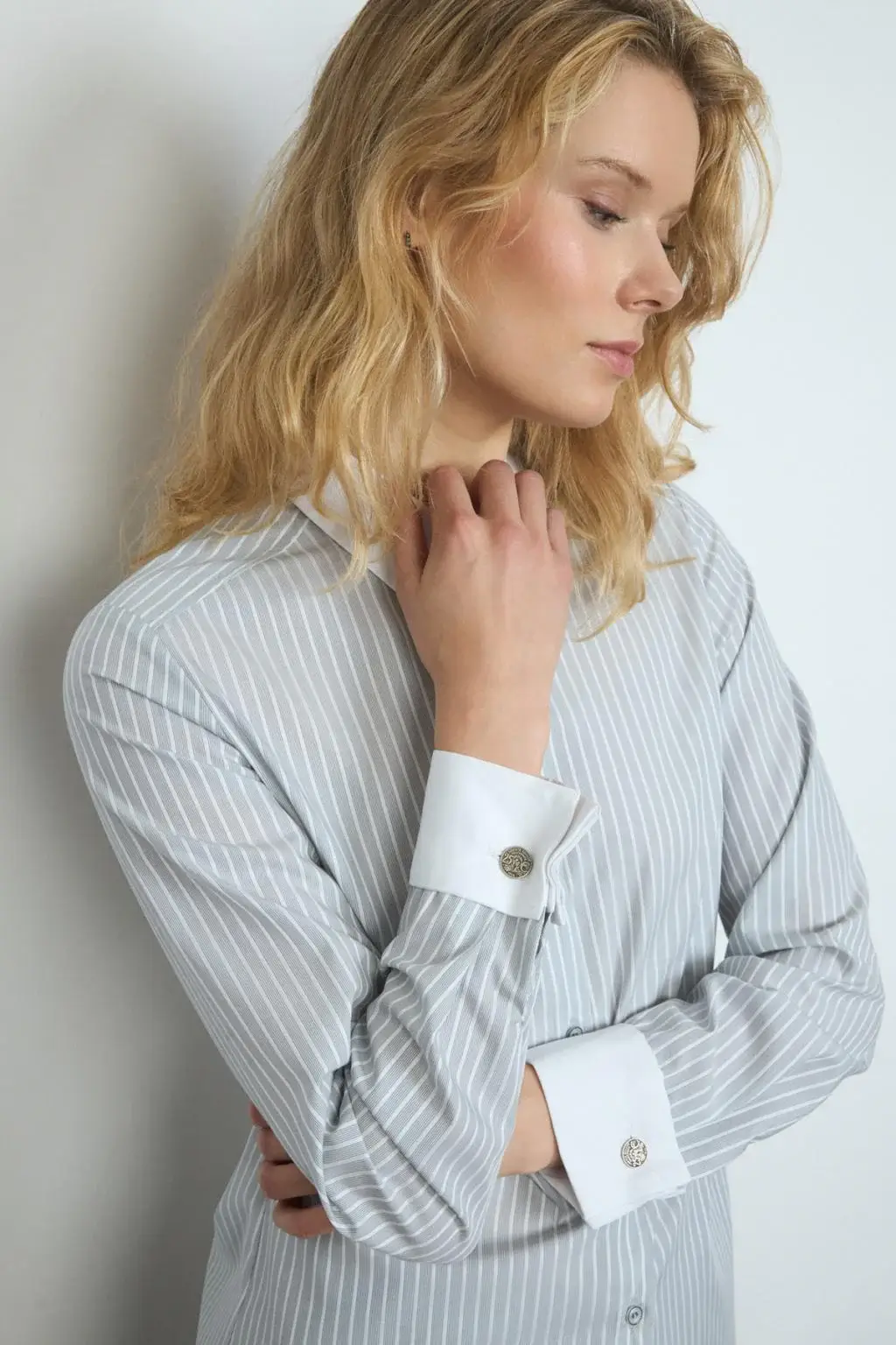 Πουκάμισο με κάθετες ρίγες σε ίσια γραμμή. Διαθέτει λευκό γιακά και ασορτί μανσέτες. Στις μανσέτες υπάρχει ιδιαίτερο κουμπί για κλείσιμο και το στρίφωμά του πουκαμίσου είναι στρογγυλεμένο.