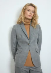 Καρό σακάκι σε γκρι χρώμα. Διαθέτει γιακά με εγκοπή στο πέτο. Σταυρωτό κλείσιμο μπροστά με μεταλλικό κουμπί. Μακριά μανίκια με μη λειτουργική πατιλέτα με κουμπιά. Τέλος διαθέτει τσέπες με καπάκι μπροστά.