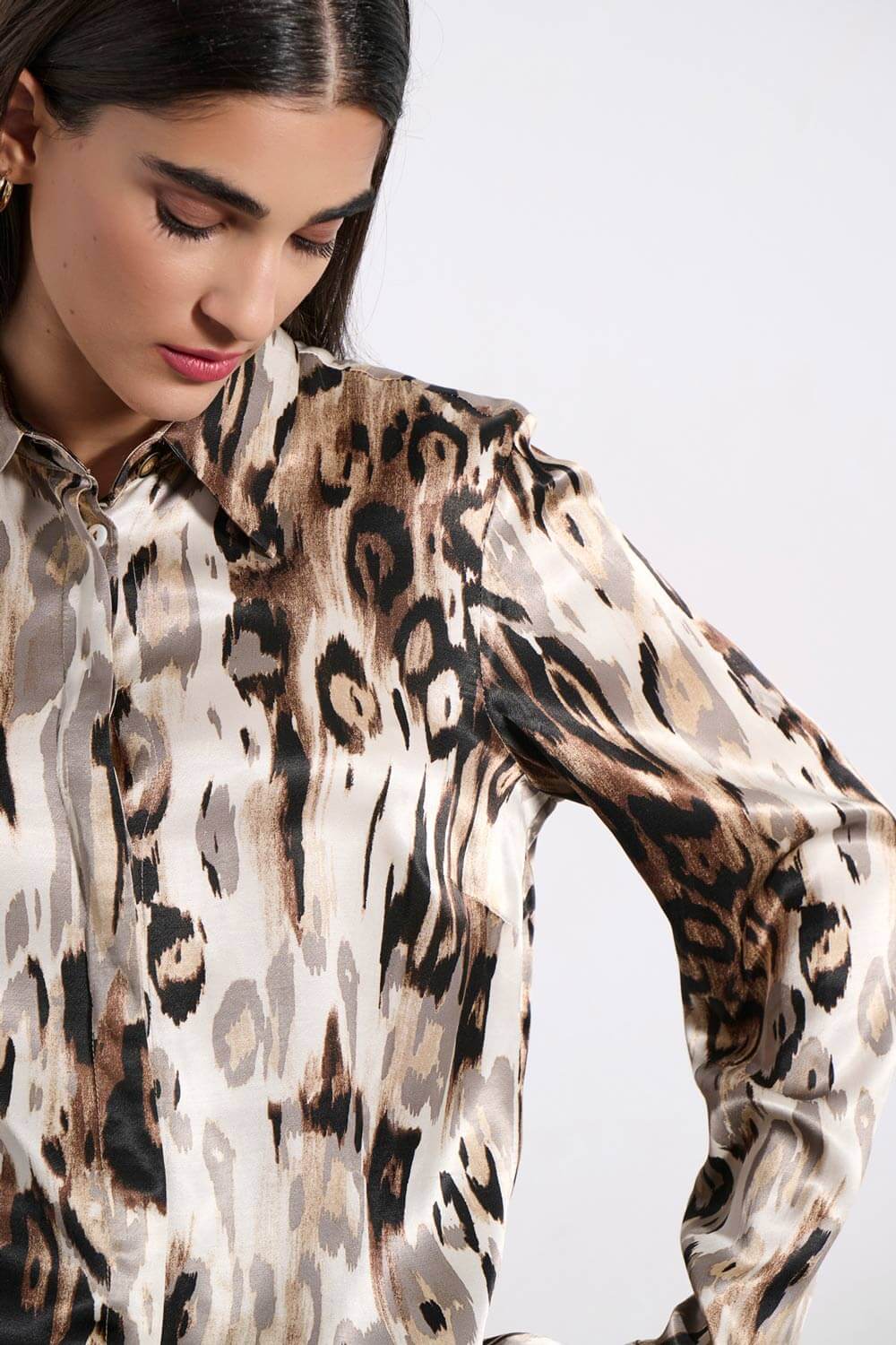 Γυναικείο animal print πουκάμισο σατέν με μακριά μανίκια και κλασικό γιακά. Διαχρονική επιλογή για κομψό και εντυπωσιακό στυλ.