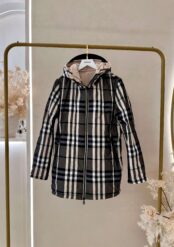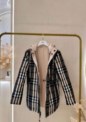 Γυναικείο μπουφάν διπλής όψης μπεζ καρό με κουκούλα και φερμουάρ δύο κατευθύνσεων.